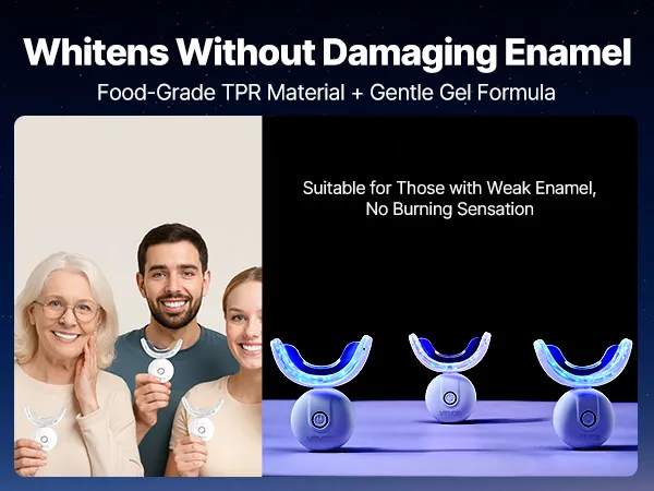 Wygodna nakładka na zęby: Zestaw do wybielania zębów zawiera nakładkę w kształcie litery U, wykonaną z miękkiego tworzywa TPR+ABS, która idealnie dopasowuje się do zębów, nie ślizgając się i nie podrażniając dziąseł. Wygodna w noszeniu podczas mówienia i uśmiechania – bez podrażnień i ucisku.