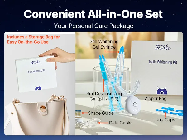 W zestawie kompletny zestaw do wybielania: Zestaw do wybielania zębów zawiera 4 żele wybielające po 5 ml, 1 żel znoszący nadwrażliwość, wzornik kolorów, kabel do ładowania i woreczek do przechowywania. Wszystko, czego potrzebujesz do pełnego cyklu wybielania – bez konieczności zakupu dodatkowych produktów.