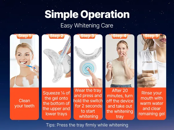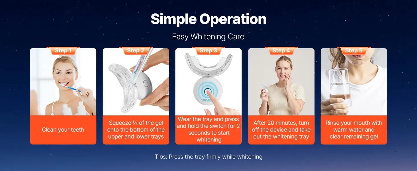 Czerwone i niebieskie diody LED przyspieszają proces wybielania. W połączeniu z delikatną formułą żelu, ten zestaw do wybielania zębów LED skutecznie usuwa przebarwienia i żółte naloty – koniec z ostrymi smugami i bolesnymi zabiegami.