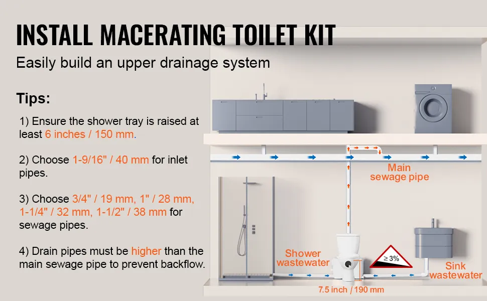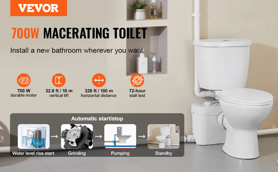 Wysoka wydajność transportu: Ten system toalet z rozdrabniaczem został zaprojektowany specjalnie dla domów bez fabrycznie zainstalowanych odpływów i wyposażony jest w trwały silnik o mocy 700 W, który zapewnia doskonałą wydajność zasysania i transportu ścieków. Ten system kanalizacyjny z przepływem w górę osiąga pionową wysokość podnoszenia 10 m i poziomą odległość transportu 100 m (328 stóp).