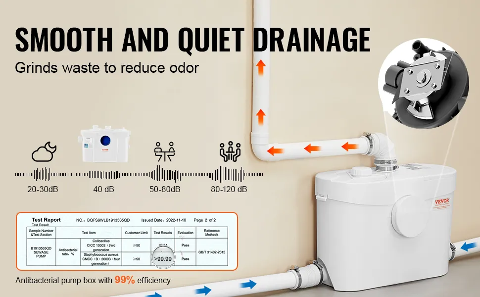 Wbudowane ostre ostrza rozdrabniają ścieki, śmieci i włosy na drobne cząsteczki, zapewniając płynniejszy przepływ wody bez zatykania. Hałas generowany podczas tego procesu jest na tyle cichy, że nie zakłóca snu.