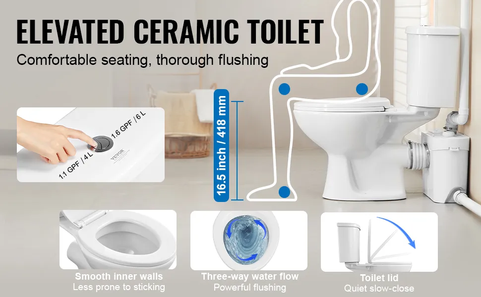 Czystość i higiena: Wytrzymała ceramiczna toaleta z podwójnym spłukiwaniem jest łatwa w czyszczeniu i ma podwyższoną konstrukcję, co zapewnia komfort użytkowania osobom o ograniczonej sprawności ruchowej. Posiada pojemny zbiornik na wodę z podwójnym spłukiwaniem, co zapewnia skuteczne czyszczenie. Pompa posiada wbudowany odpowietrznik, który optymalizuje wydajność i wentylację, redukując nieprzyjemne zapachy po użyciu.