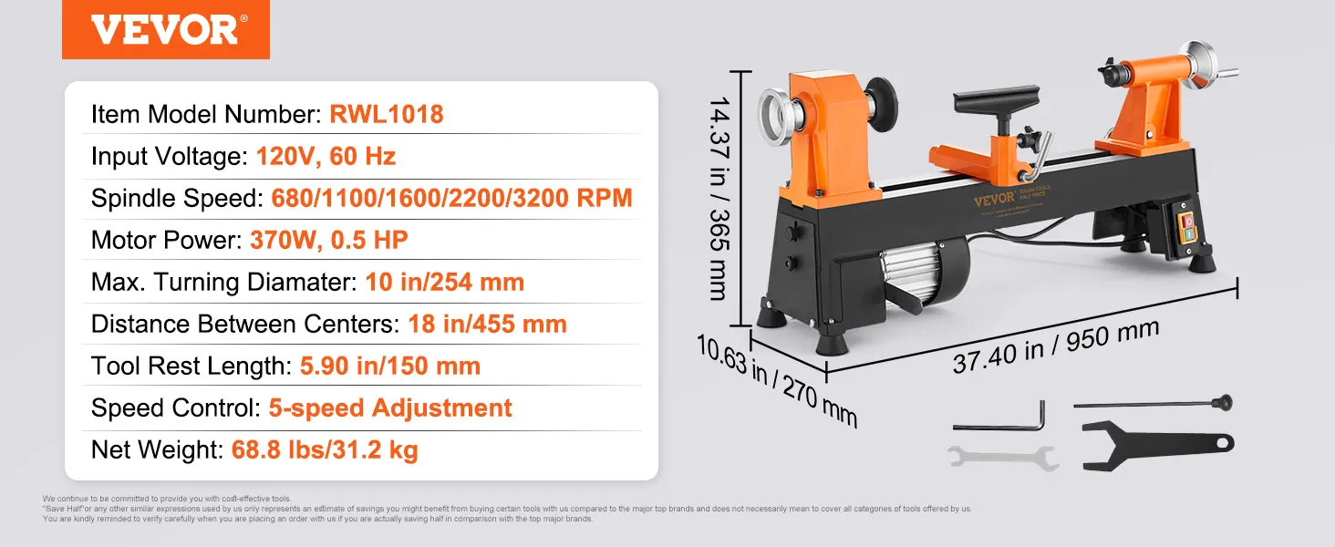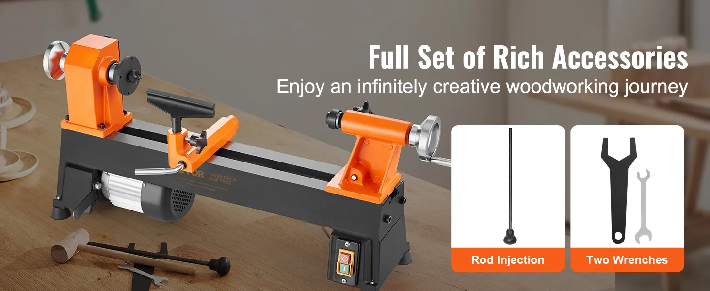 Ta tokarka jest dostarczana z pełnym zestawem akcesoriów, takich jak 1 x wtrysk pręta, 2 x klucze, 4 x podkładki pod stopy, 1 x płyta czołowa itp. Z łatwością spełni wszystkie Twoje potrzeby związane z majsterkowaniem.
