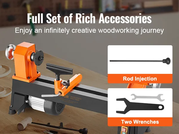 PROFESJONALNE AKCESORIA: Z 1 x wtryskiem pręta, 2 x kluczami, 4 x podkładkami pod stopy, 1 x płytą czołową i nie tylko, nasza tokarka oferuje kompleksowy zestaw akcesoriów spełniających wszystkie Twoje potrzeby związane z majsterkowaniem. Ciesz się wygodą i wyrusz w nieograniczoną, kreatywną podróż w obróbce drewna.