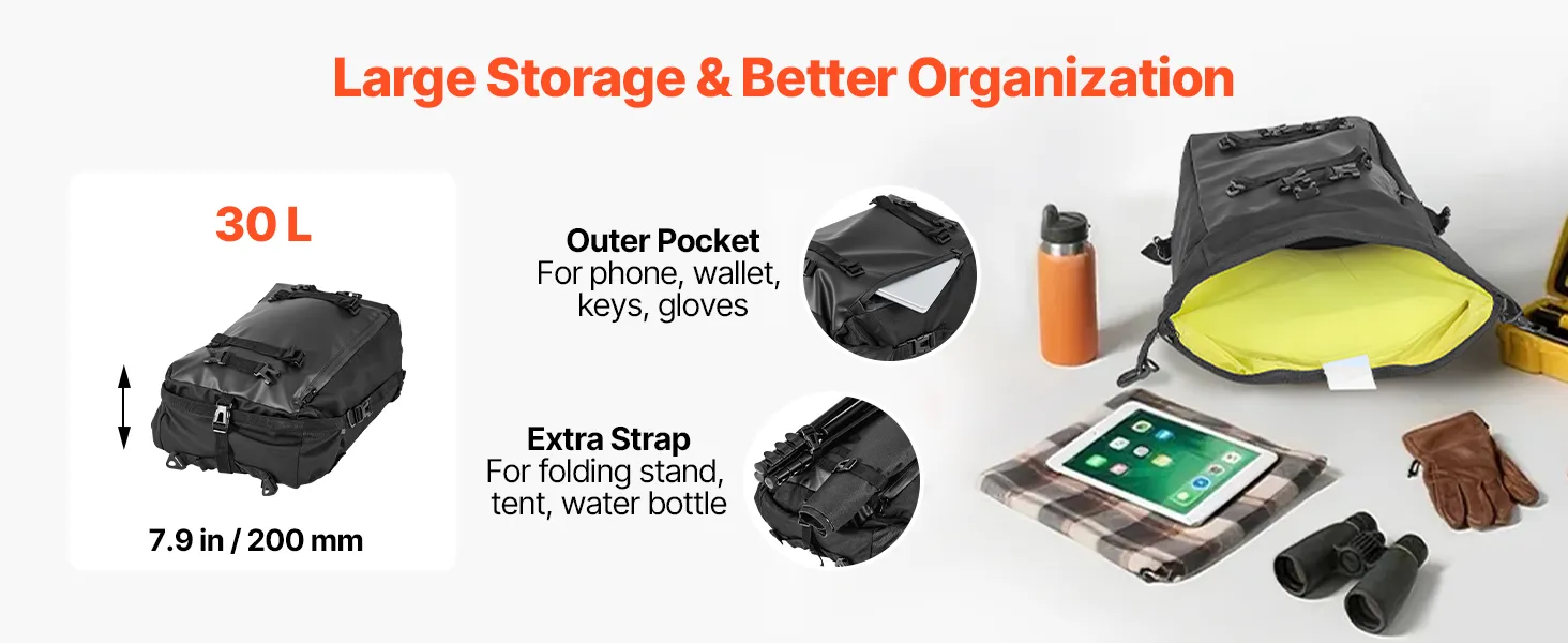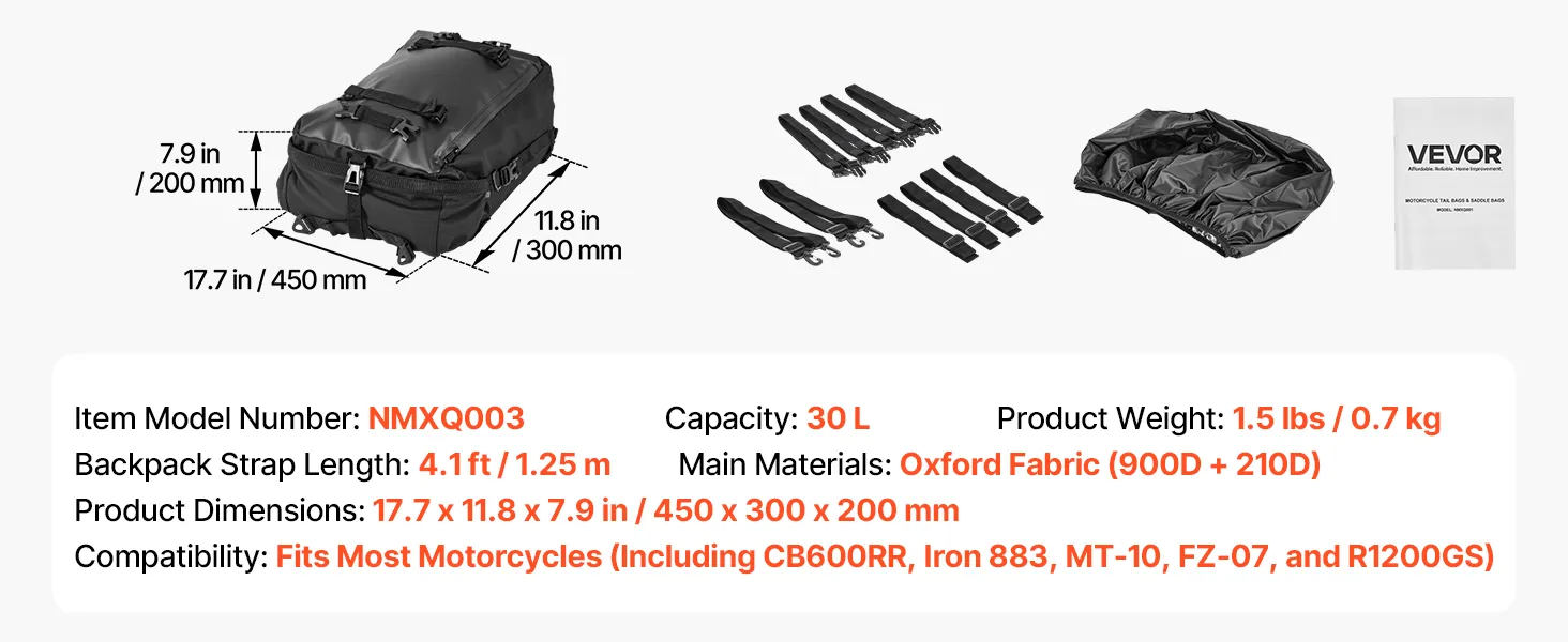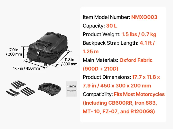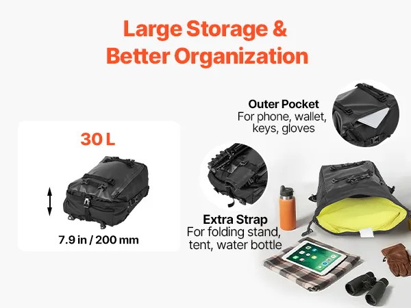 Pojemność 30 l: Ta lekka torba motocyklowa na tylne siedzenie ma wymiary 17,7 x 11,8 x 7,9 cala (45 x 30 x 20 cm). Z łatwością pomieści 15-calowego laptopa, kurtkę motocyklową, odzież przeciwdeszczową, jedzenie i narzędzia naprawcze – wszystko, czego potrzebujesz podczas jazdy.