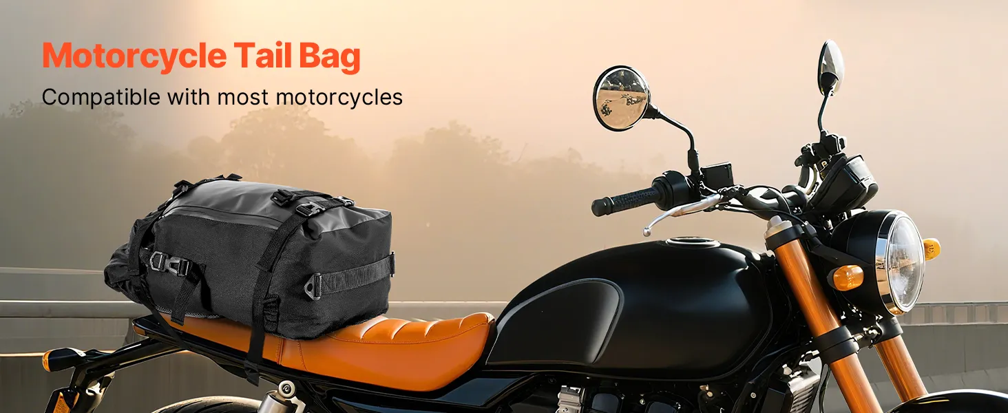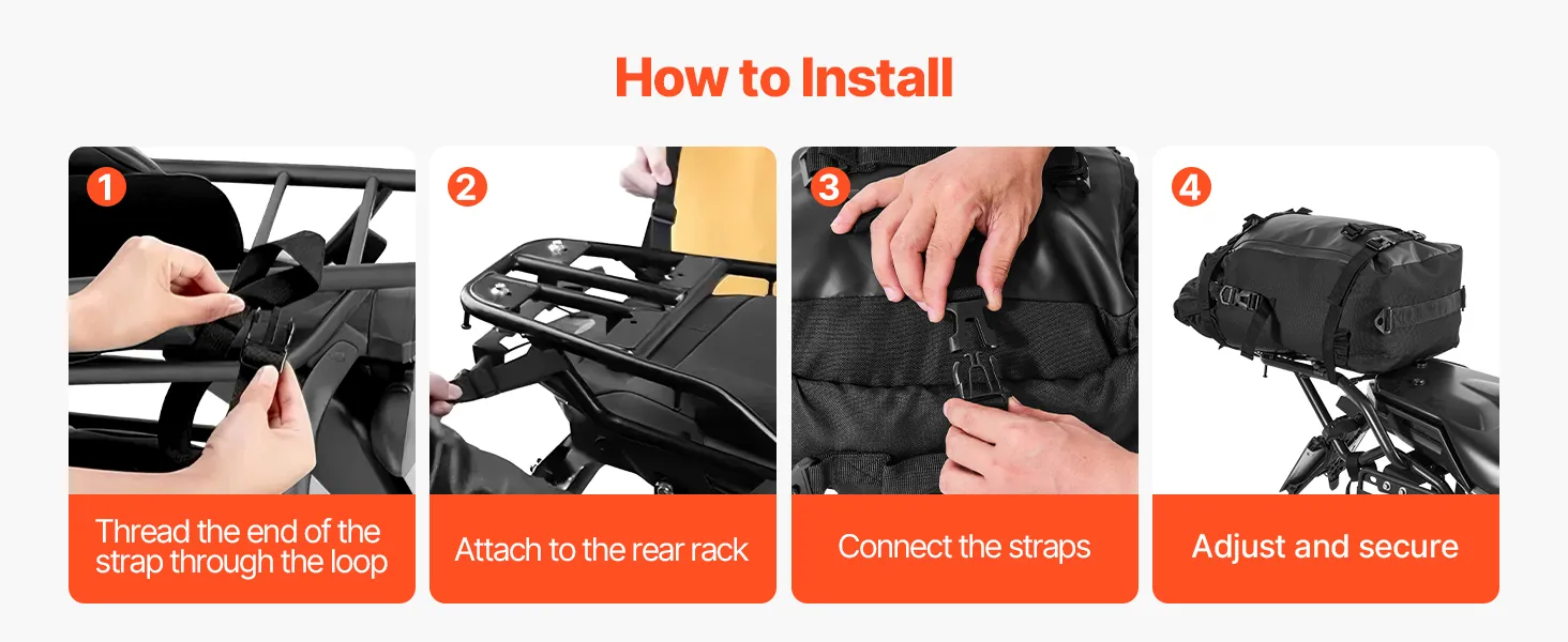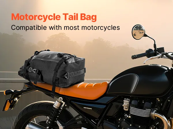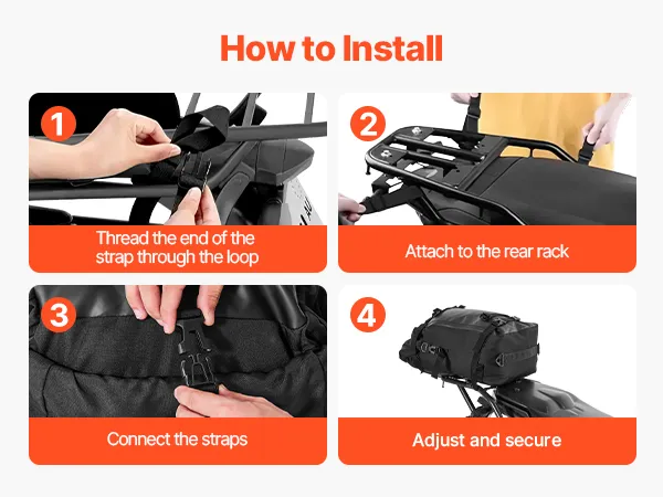 Pasuje do większości motocykli: Ta torba motocyklowa pasuje do większości motocykli, w tym turystycznych, standardowych, cruiserów i crossowych. Cztery paski można przewlec przez otwory w ramie lub przez tylną poręcz, co zapewnia szybki i łatwy montaż. Zapięcie klamer utrzymuje torbę bezpiecznie na miejscu.