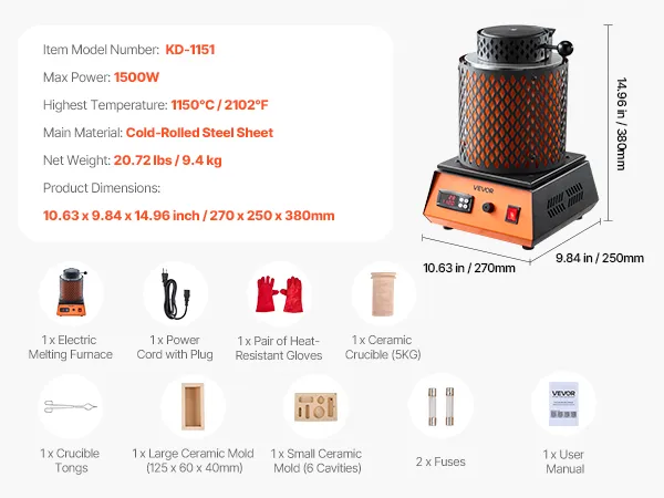 Szybka wydajność: Nasz cyfrowy elektryczny piec do topienia łączy moc 1500 W z inteligentną kontrolą temperatury, zapewniając szybkie i równomierne topienie metali. Stabilna temperatura do 1150°C gwarantuje precyzyjne rezultaty i zapewnia fachowcom niezawodną pracę.