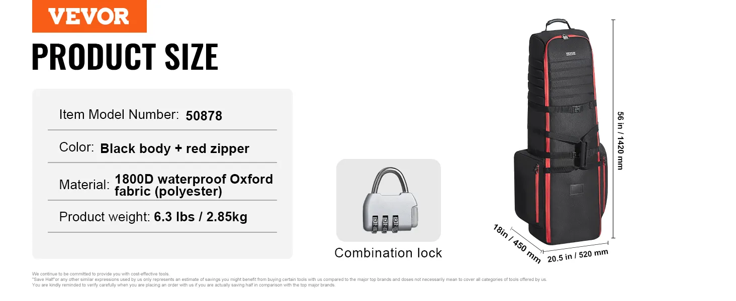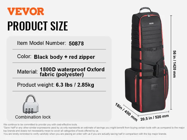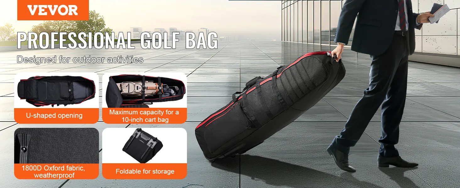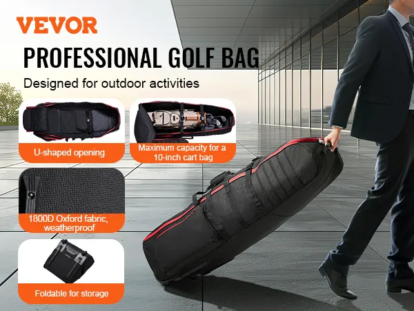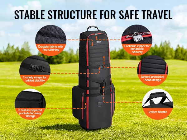 Ten pokrowiec na torbę podróżną do golfa, wykonany z odpornej na warunki atmosferyczne tkaniny Oxford 1800D, zapewnia doskonałą odporność na wstrząsy i wodoodporność. Torba posiada dwie duże zewnętrzne kieszenie zapinane na zamek. Zamki są zamykane na klucz. Paski mocujące kije golfowe.