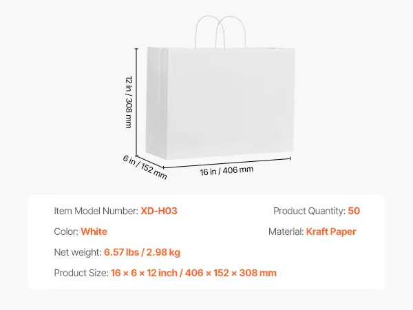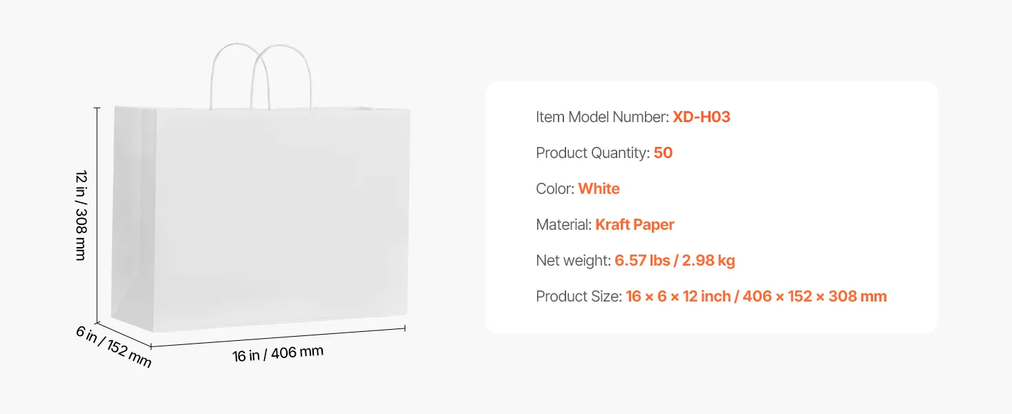 Torby papierowe VEVOR Kraft, opakowanie 50 szt., torby prezentowe z uchwytami, 406 x 152 x 308 mm, duże torby na zakupy, papierowe torby na zakupy, torby Kraft, na urodziny, wesela, zakupy, prezenty, białe