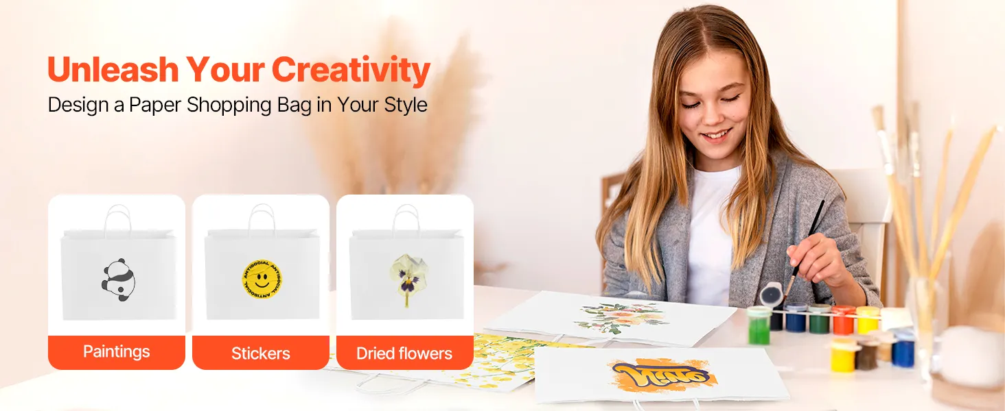 Daj się ponieść wyobraźni i kreatywności i stwórz papierową torbę na zakupy według własnego stylu, używając farb, naklejek, suszonych kwiatów i innych ozdób.