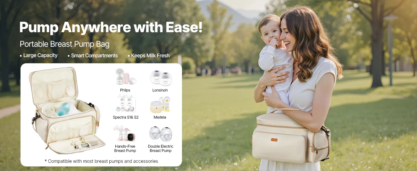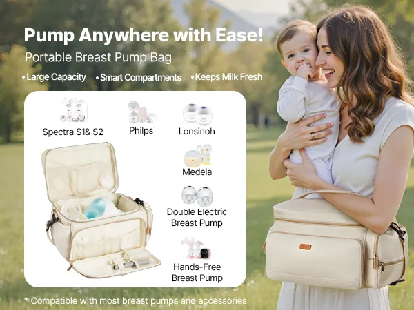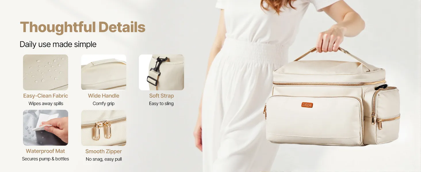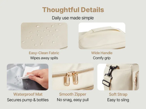 Łatwy w przenoszeniu: Nasza torba na laktator jest wyposażona w wodoodporną matę, dzięki czemu możesz bezpiecznie umieścić laktator, butelki i akcesoria w miejscach publicznych. To przemyślany wybór dla pracujących lub karmiących matek, które często są w ruchu.