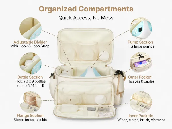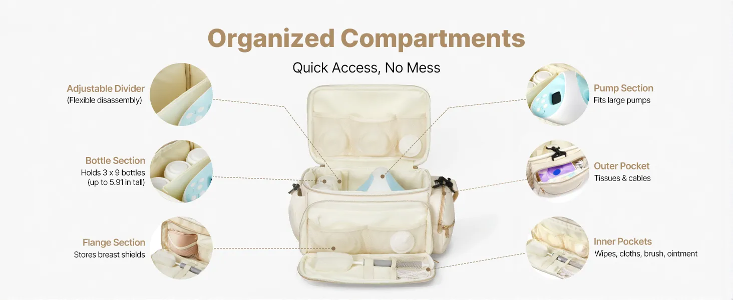 Przechowywanie w uporządkowany sposób: Główna komora naszej torby na laktator zapewnia bezpieczne przechowywanie laktatorów i butelek, a siateczkowe kieszenie pomieszczą chusteczki nawilżane, szczoteczki lub krem do brodawek sutkowych. Dodatkowe kieszenie zapewniają łatwy dostęp do telefonów komórkowych, kluczy i chusteczek. Wszystko pozostaje uporządkowane i łatwo dostępne.