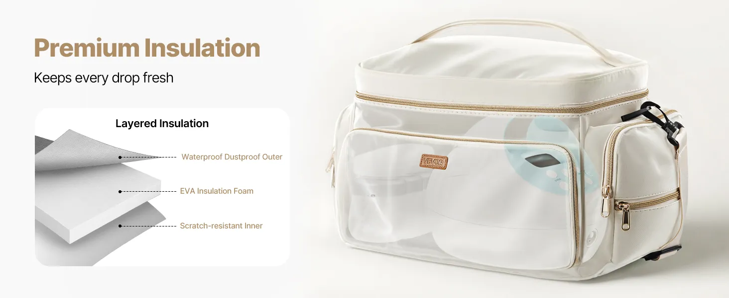 Nasza torba podróżna na laktatory ma trójwarstwową konstrukcję z wodoodporną powłoką zewnętrzną, pianką izolacyjną EVA i odporną na zarysowania podszewką, dzięki czemu mleko zachowuje świeżość na dłużej.