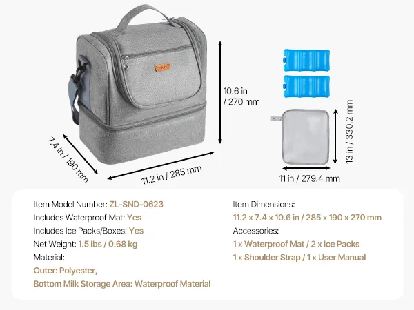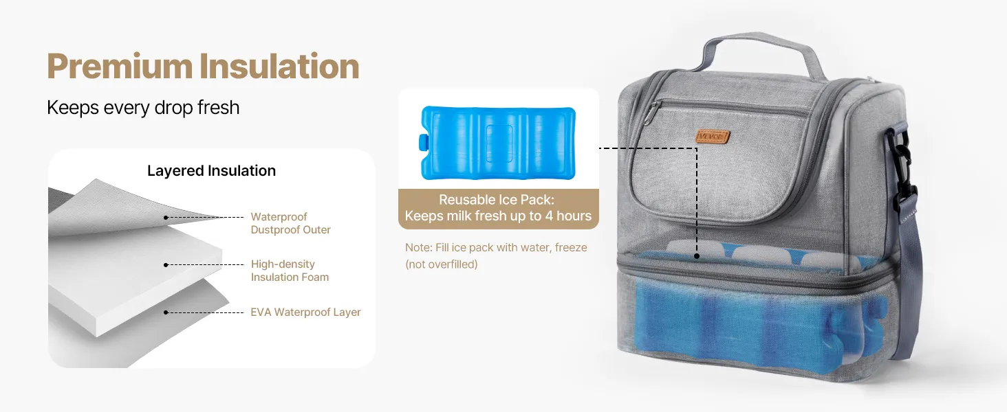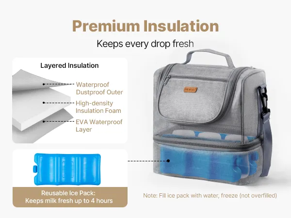 Izolowana świeżość: Dwie kieszenie wyściełane folią i wodoodporne dno torby do karmienia utrzymują mleko w chłodzie do 4 godzin dzięki wkładom chłodzącym. Matki mogą polegać na stabilnej izolacji, która zapewnia świeżość.