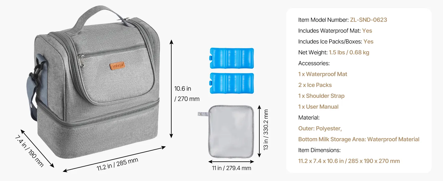 VEVOR Torba na laktator przenośny 285 x 190 x 270 mm, etui na laktator z wkładem chłodzącym, pasuje do modeli S1/S2, akcesoria do laktatora i przechowywanie mleka matki, do pracy, podróży i użytku rodzinnego, kolor szary
