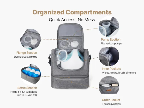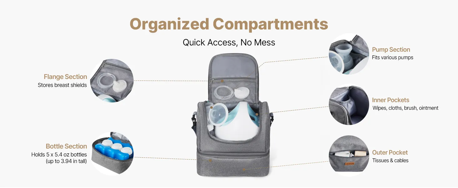 Przechowywanie w uporządkowany sposób: Główna komora naszej torby na laktator zapewnia bezpieczne przechowywanie laktatorów i butelek, a siateczkowe kieszenie pomieszczą chusteczki nawilżane, szczoteczki lub krem do brodawek sutkowych. Dodatkowe kieszenie zapewniają łatwy dostęp do telefonów komórkowych, kluczy i chusteczek. Wszystko pozostaje uporządkowane i łatwo dostępne.