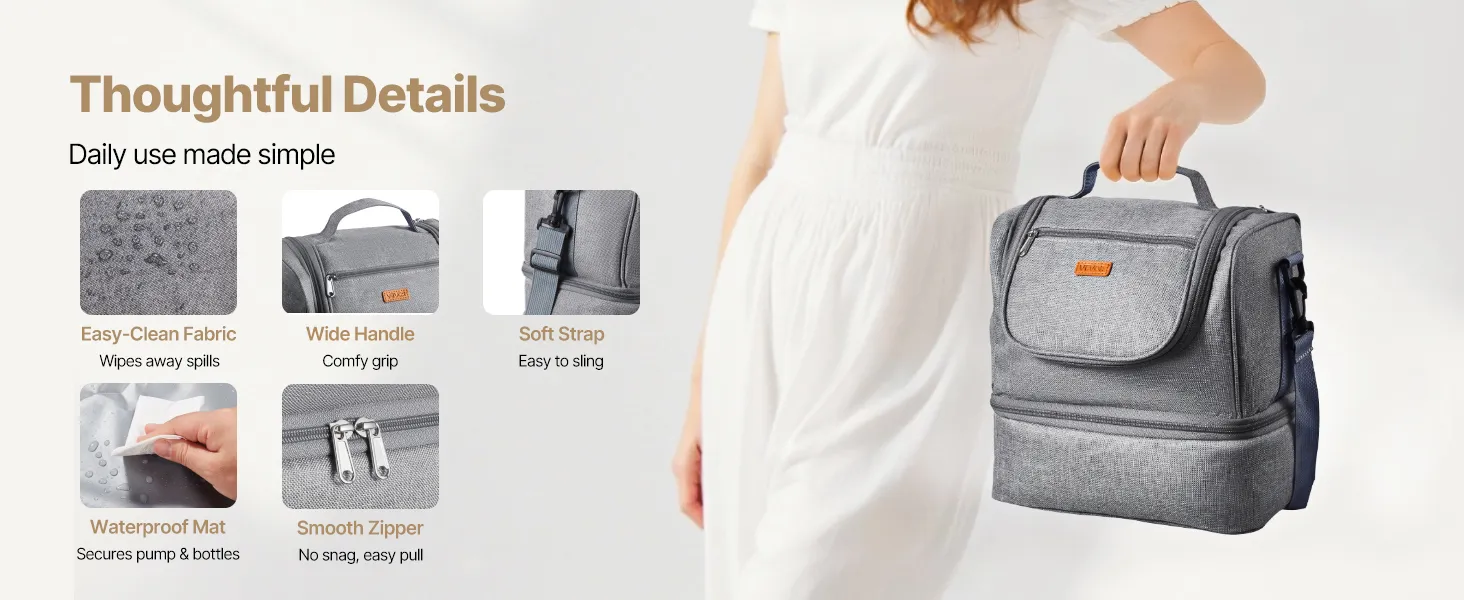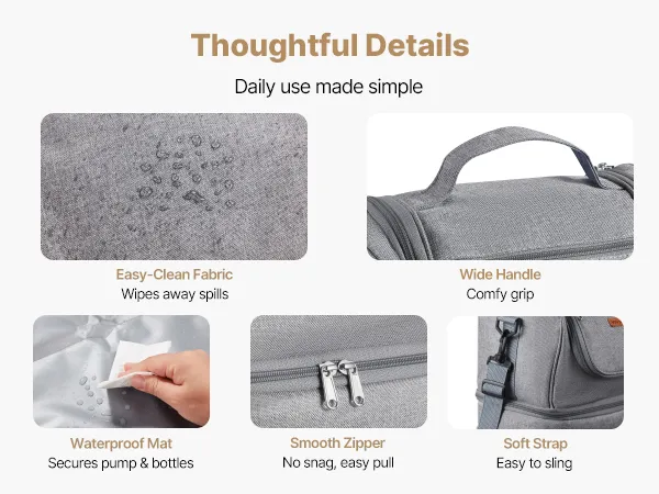 Szeroki uchwyt i wyściełany pasek torby do przechowywania laktatora zapewniają wygodę noszenia. Wodoodporna wyściółka chroni butelki przed wyciekaniem. Łatwy w pielęgnacji materiał można szybko wyczyścić, a gładkie zamki błyskawiczne działają bez wysiłku.
