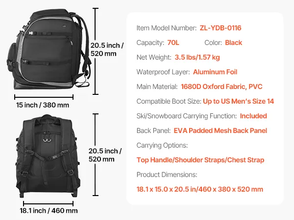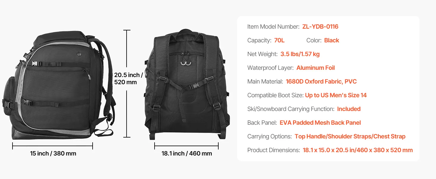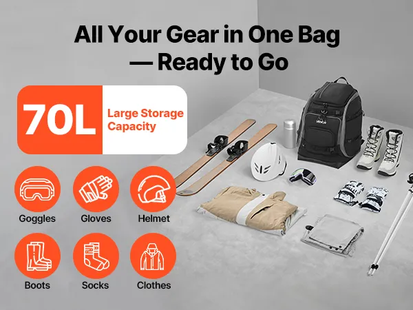 Torba na buty narciarskie VEVOR, plecak podróżny 70 l na buty snowboardowe, z wodoodporną powłoką zewnętrzną i dnem, 1680D Oxford, torba na narty, snowboardy, kaski, gogle, rękawice i akcesoria (czarna)