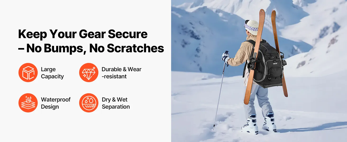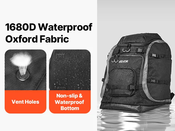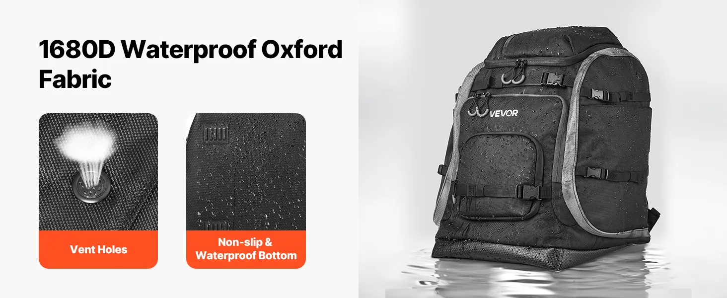 Wodoodporny i wytrzymały: Wykonany z wodoodpornej tkaniny Oxford 1680D, z gumowanym spodem i wodoodporną warstwą folii aluminiowej, nasz plecak na buty narciarskie skutecznie chroni przed śniegiem i deszczem, dzięki czemu Twój sprzęt pozostaje suchy i chroniony