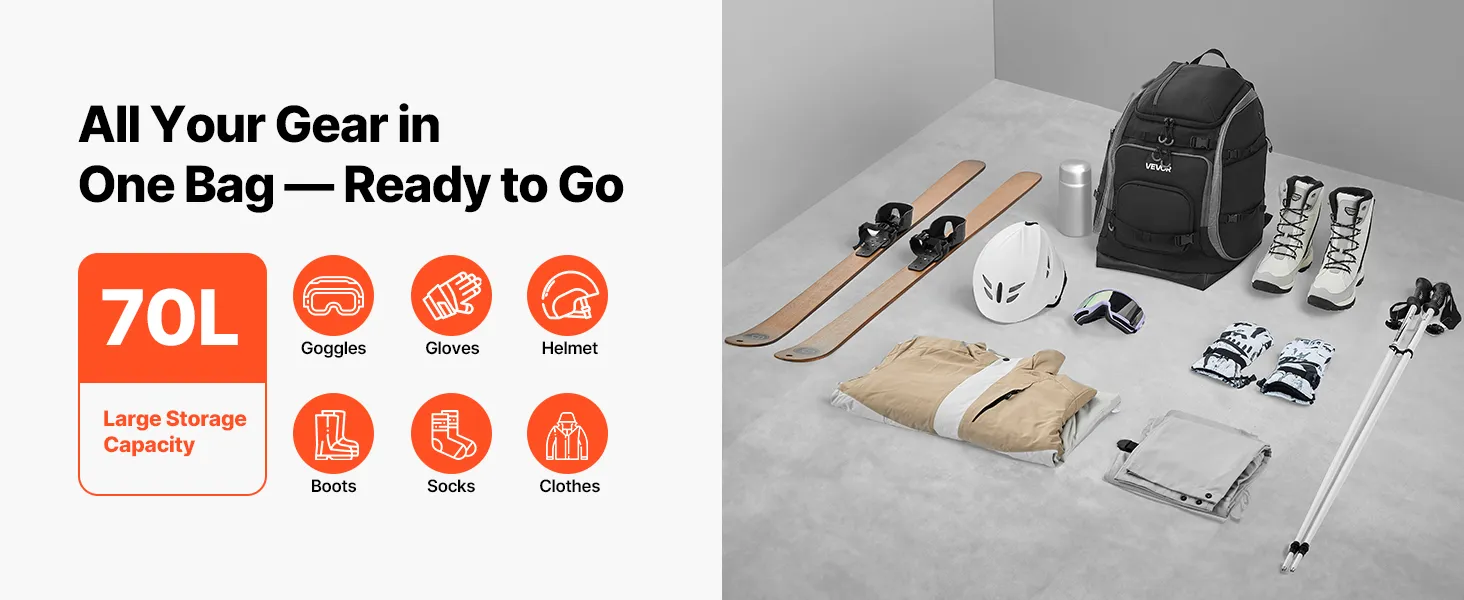 70 l przestrzeni do przechowywania: Nasza torba na buty narciarskie została starannie zaprojektowana, aby z łatwością pomieścić buty, kaski, gogle, odzież i inne cenne przedmioty. Utrzymaj cały swój sprzęt w porządku i łatwo go przetransportuj.