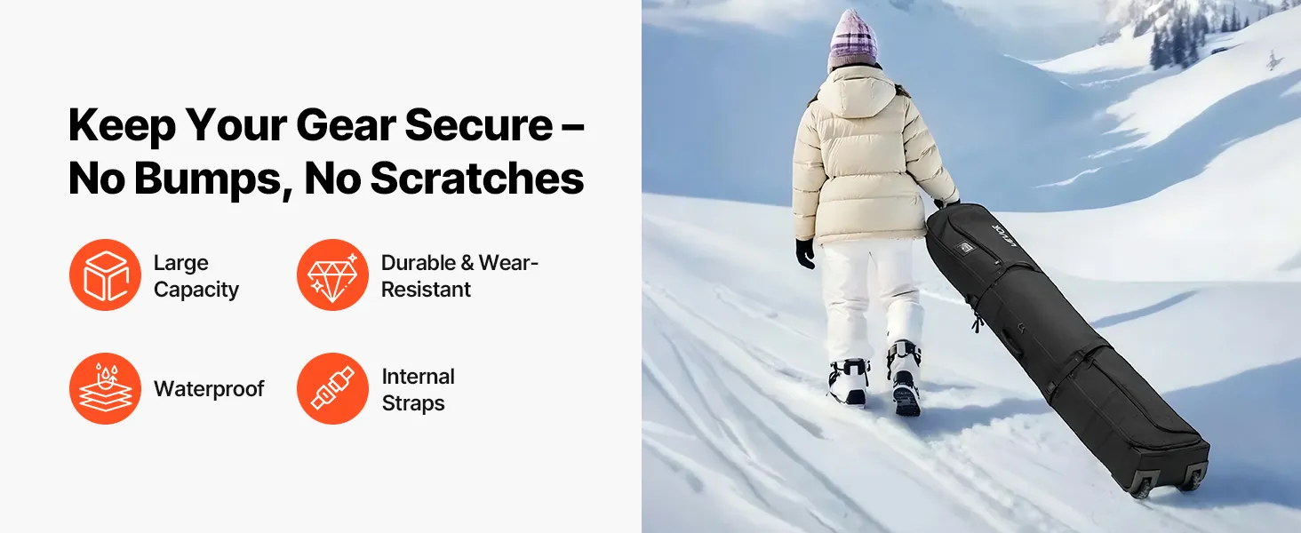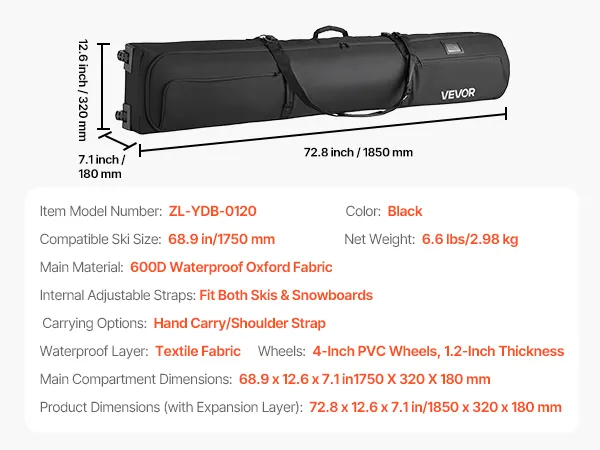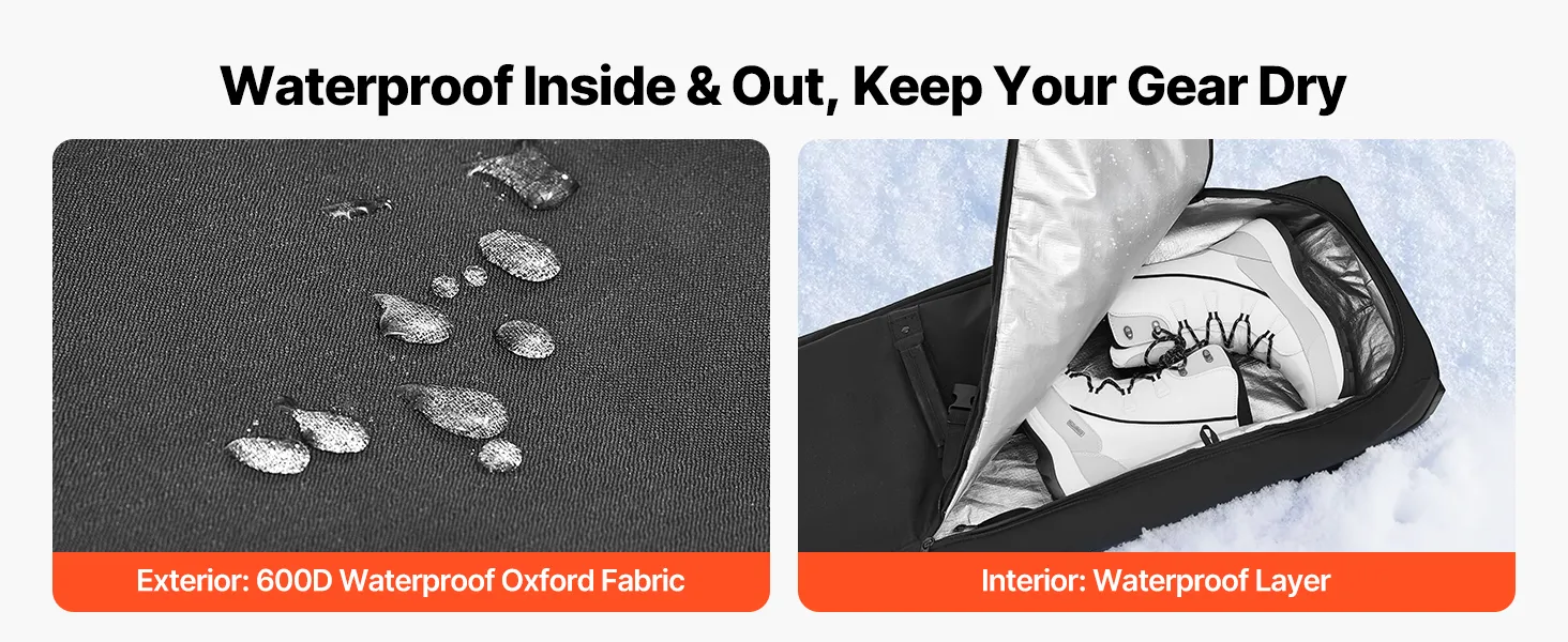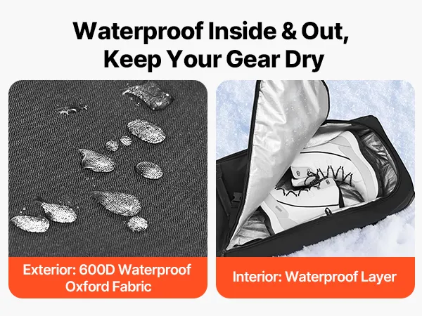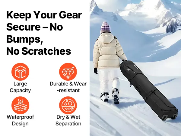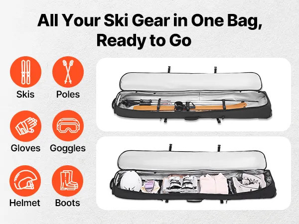 Dzięki przestronnej przestrzeni do przechowywania i licznym przegródkom wykonanym z wodoodpornego i wytrzymałego materiału Oxford, nasza torba snowboardowa na kółkach jest łatwa do noszenia w ręce lub na ramieniu. Zmieści cały sprzęt narciarski w jednej torbie.