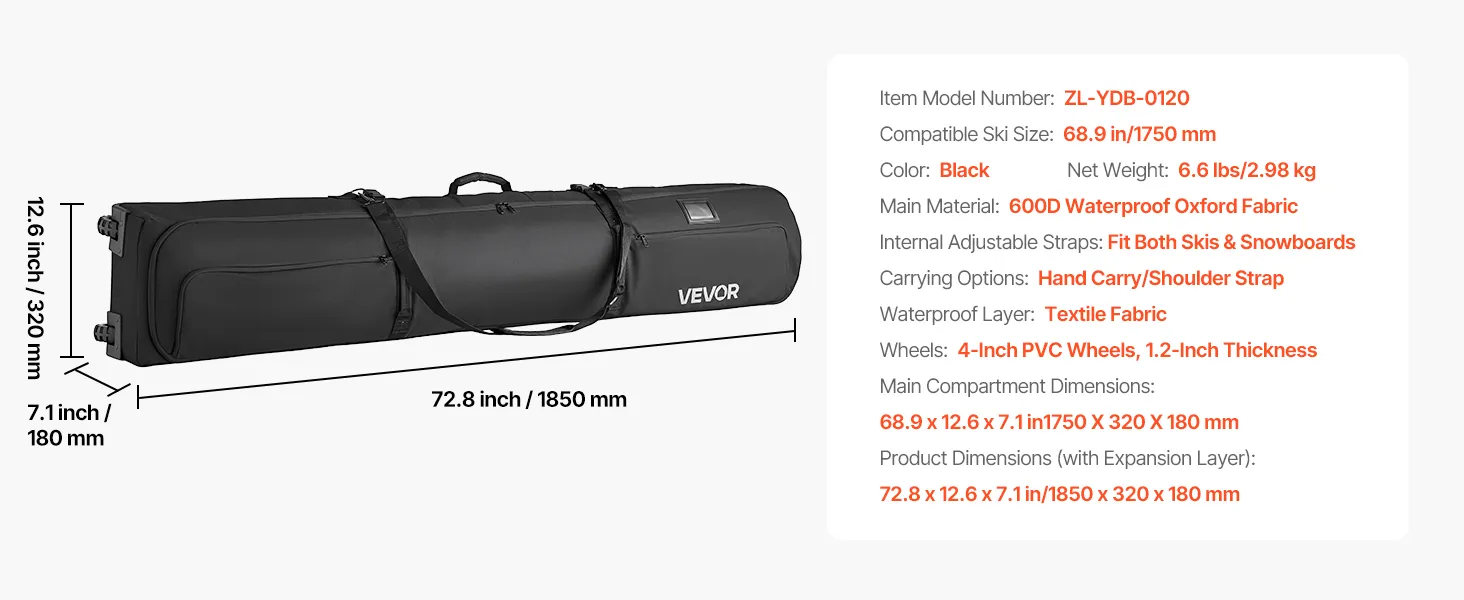 Ta torba na narty z kółkami jest wykonana z lekkiego, wodoodpornego materiału Oxford 600D z ochronną podszewką. Chroni przed śniegiem i deszczem, chroni sprzęt przed wilgocią i rdzą oraz umożliwia łatwe przenoszenie.