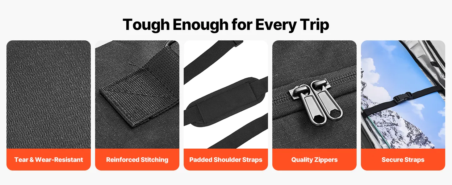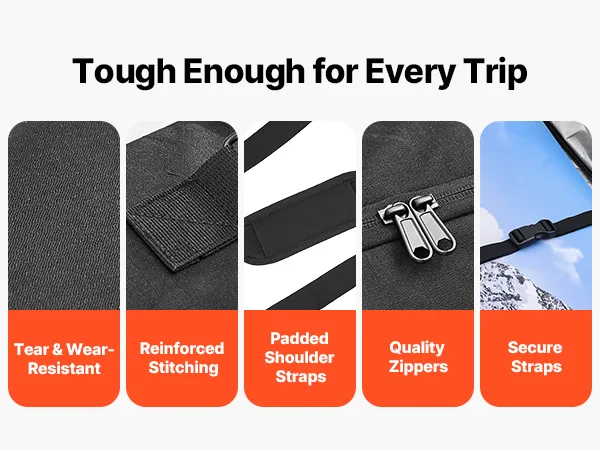 Trwała konstrukcja: Nasza torba na narty na kółkach wykonana jest z wytrzymałego, wodoodpornego materiału Oxford 600D, ma wzmocnione zamki i wyściełane paski na ramiona i została zaprojektowana tak, aby chronić Twój sprzęt podczas niezliczonych przygód.