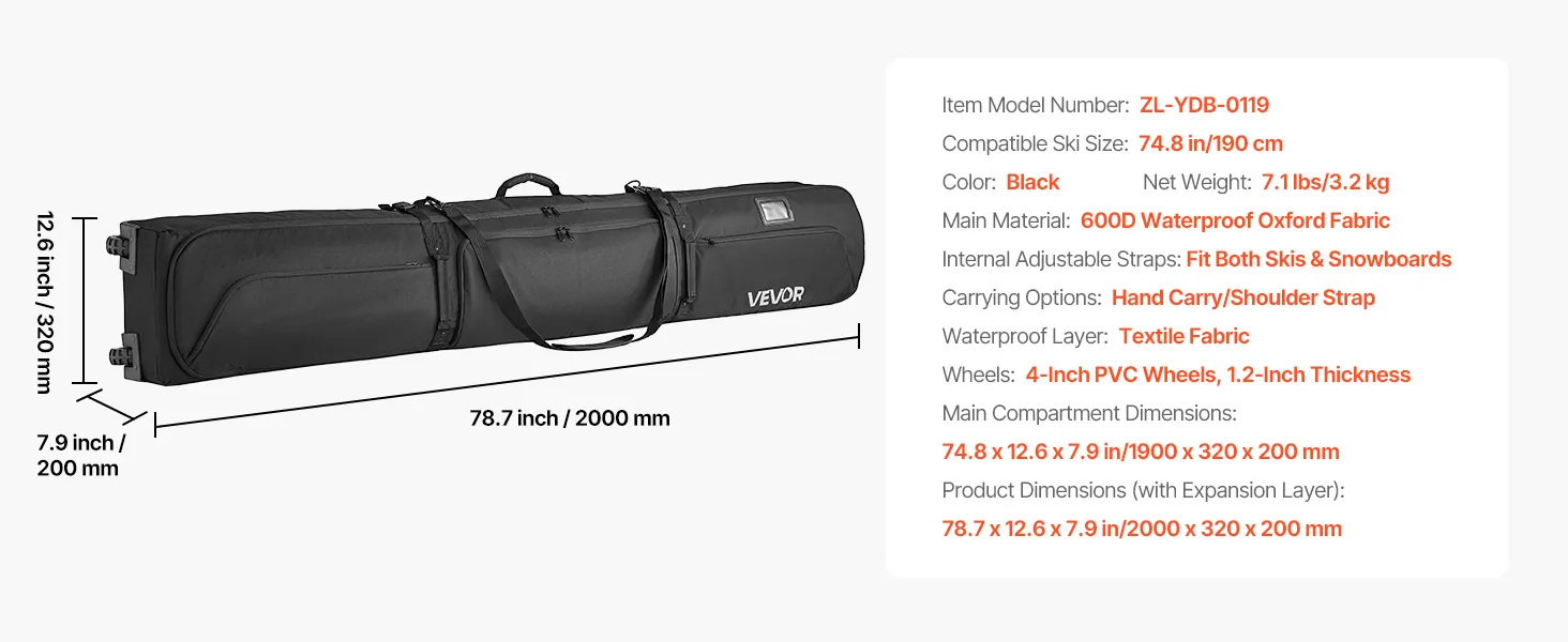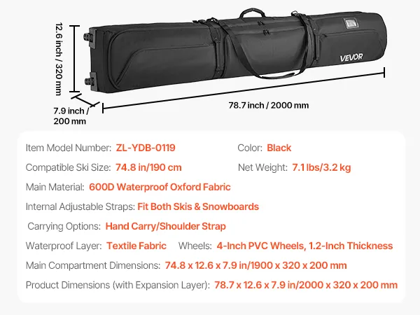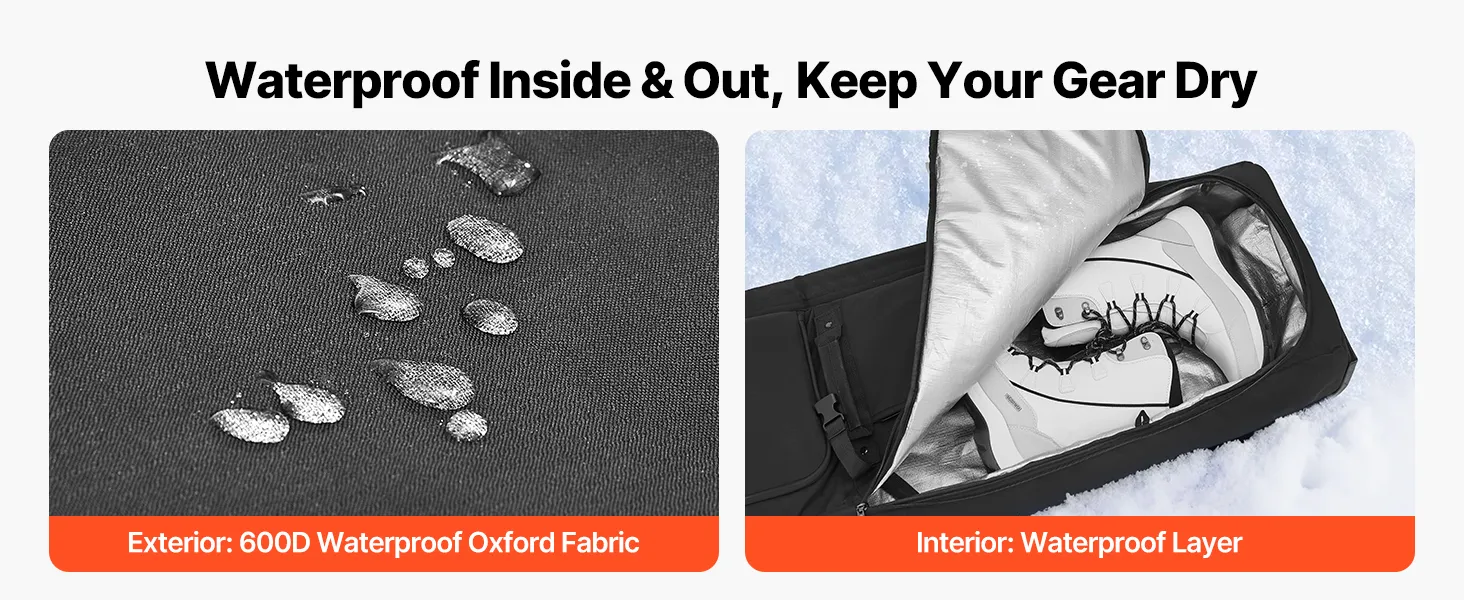 Ta torba na narty na kółkach jest wykonana z lekkiego, wodoodpornego materiału Oxford 600D z ochronną podszewką. Chroni przed śniegiem i deszczem, chroni sprzęt przed wilgocią i rdzą oraz umożliwia łatwe przenoszenie.