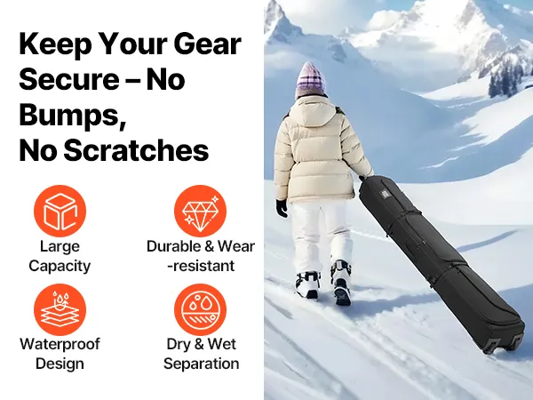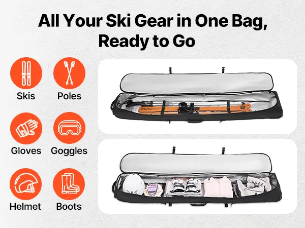 Dzięki przestronnej przestrzeni do przechowywania i licznym przegródkom wykonanym z wodoodpornego i odpornego na zużycie materiału Oxford, nasza torba snowboardowa na kółkach jest łatwa do noszenia w ręce lub na ramieniu. Pomieści cały sprzęt narciarski w jednej torbie.