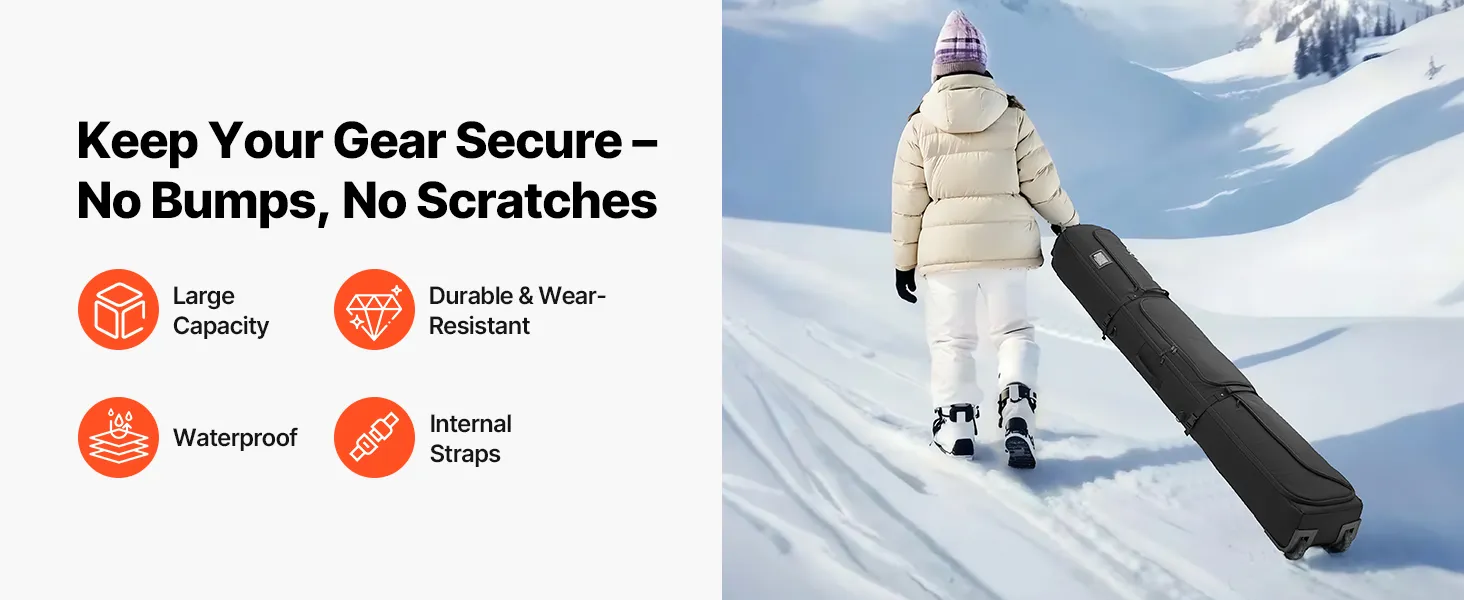 Łatwa mobilność: Ta torba na snowboard z kółkami i wyściełaną konstrukcją pozwala na bezproblemowe przenoszenie sprzętu, idealna na lotniskach i podczas długich podróży