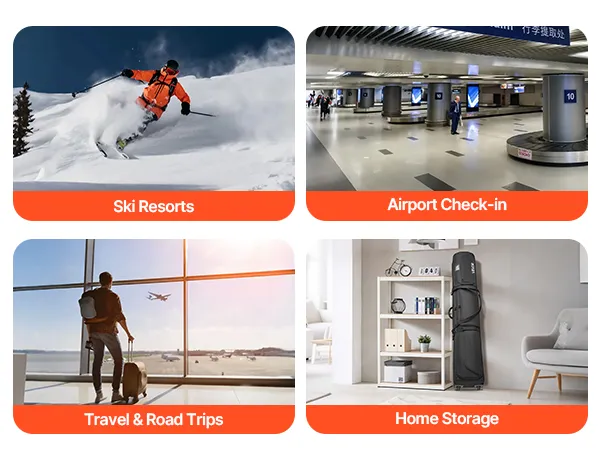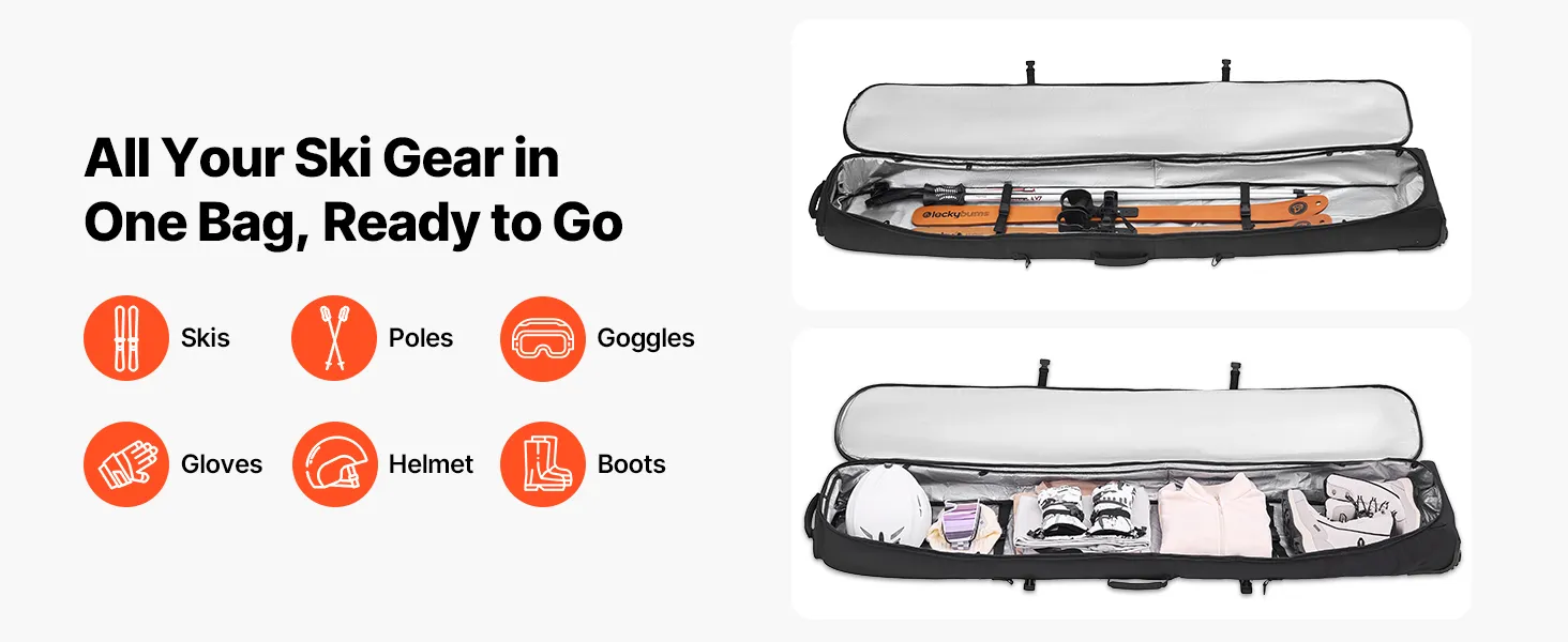 Ta torba na kółkach do transportu lotniczego zapewnia bezpieczny i niezawodny transport sprzętu w ośrodkach narciarskich, w podróży lub w domu.