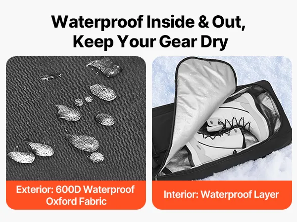 Ochrona wodoodporna: Nasza torba na narty na kółkach do podróży samolotem jest wykonana z wodoodpornego materiału wewnątrz i na zewnątrz, aby Twój sprzęt pozostał suchy nawet w śnieżnych lub mokrych warunkach.