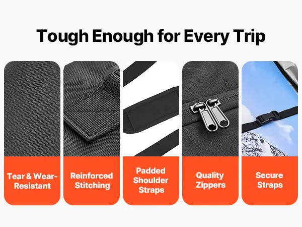Trwała konstrukcja: nasza torba na narty na kółkach wykonana z wytrzymałej, wodoodpornej tkaniny Oxford 600D ze wzmocnionymi zamkami błyskawicznymi i wyściełanymi paskami na ramiona została zaprojektowana tak, aby chronić Twój sprzęt podczas niezliczonych przygód