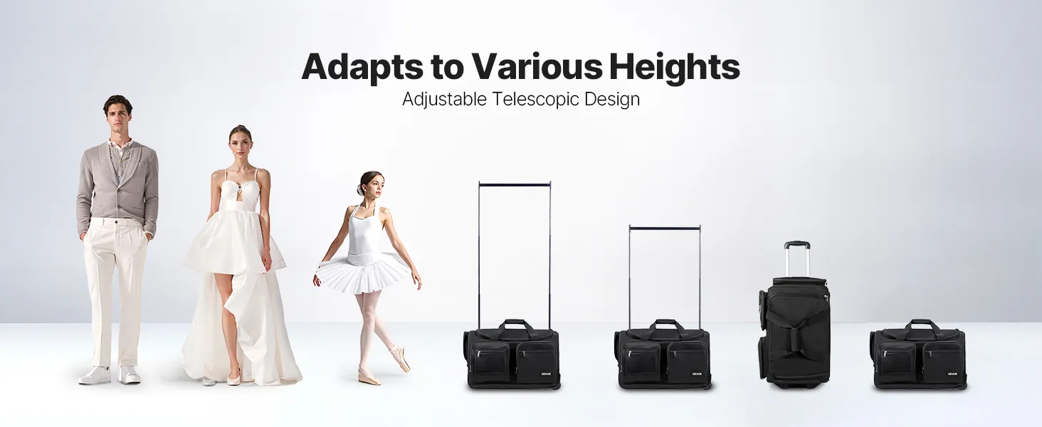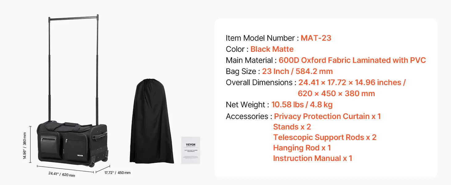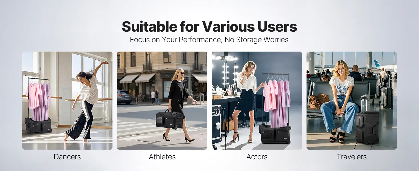 Torba taneczna VEVOR z wieszakiem na ubrania, 620x450x380 mm, na kółkach, z portem USB, regulowanym drążkiem na ubrania i zasłoną zapewniającą prywatność, idealna w podróży i na zawody, matowa czerń