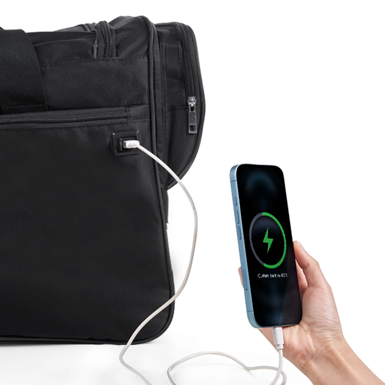 Przechowuj swój power bank w naszej torbie tanecznej z uchwytem i szybko naładuj go w dowolnym czasie i miejscu przez port USB.