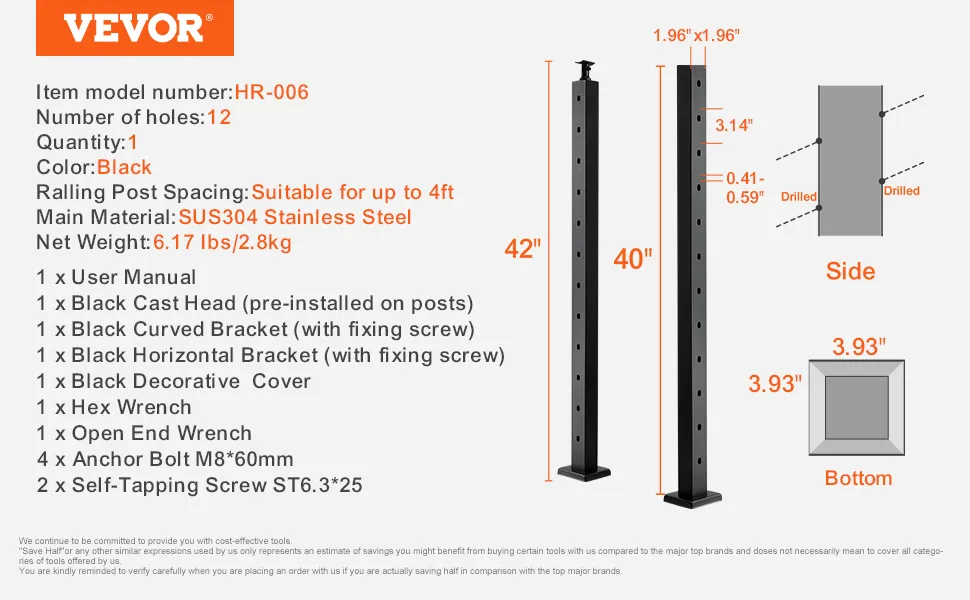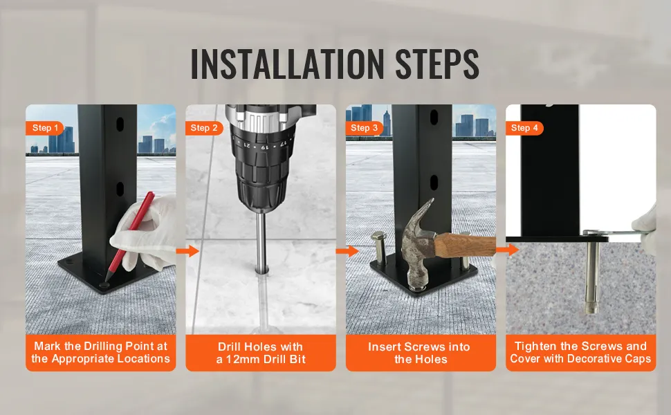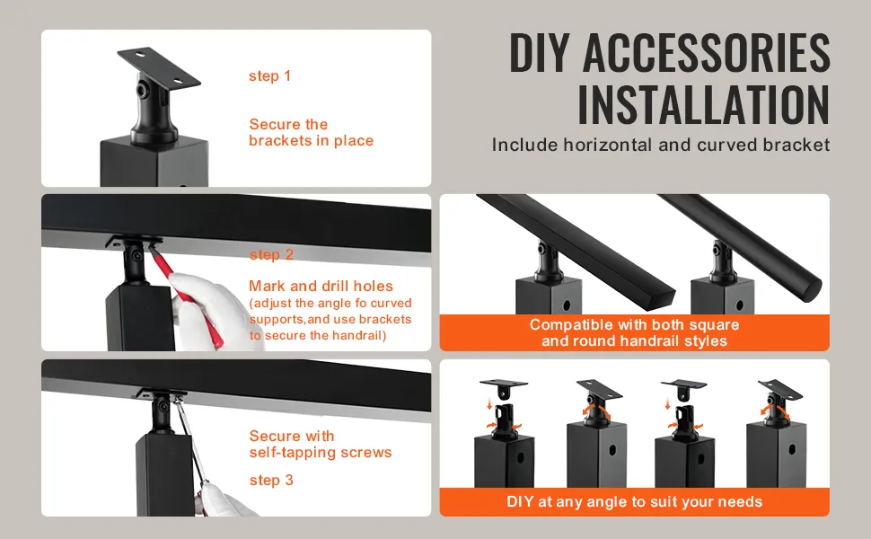 Ten stalowy słupek balustrady schodowej jest dostarczany z poziomymi i zakrzywionymi wspornikami. Nadają się do różnych typów otworów w słupkach balustrady. Jest kompatybilny zarówno z kwadratowymi, jak i okrągłymi stylami poręczy. Ta elastyczność pozwala na łatwe dostosowanie do każdego kąta poręczy. Proces instalacji może być prosty. Możesz go używać do projektów DIY bez potrzeby pomocy profesjonalisty. Dołączony wspornik nie tylko upraszcza konfigurację, zapewniając bezpieczne dopasowanie bez konieczności wzywania pomocy profesjonalisty, ale także oszczędza czas i obniża koszty. Dzięki temu możesz łatwo samodzielnie zainstalować systemy poręczy.