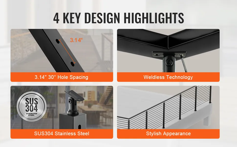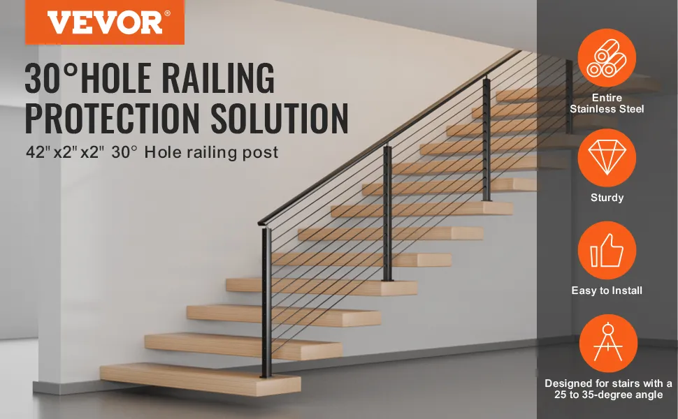 Poręcz schodowa z otworem kątowym VEVOR ma specjalną konstrukcję do schodów o kącie od 25° do 35°. Dzięki temu idealnie nadaje się do ochrony takich schodów. Konstrukcja otworu kątowego 30° zapewnia, że idealnie pasuje do tego typu schodów. Ta ukierunkowana konstrukcja gwarantuje maksymalne bezpieczeństwo. Ważne jest, aby mieć specjalistyczne systemy szynowe dostosowane do Twoich konkretnych potrzeb. Nasze słupki do poręczy kablowych spełniają ten wymóg, oferując najlepsze rozwiązanie dla schodów zakrzywionych!