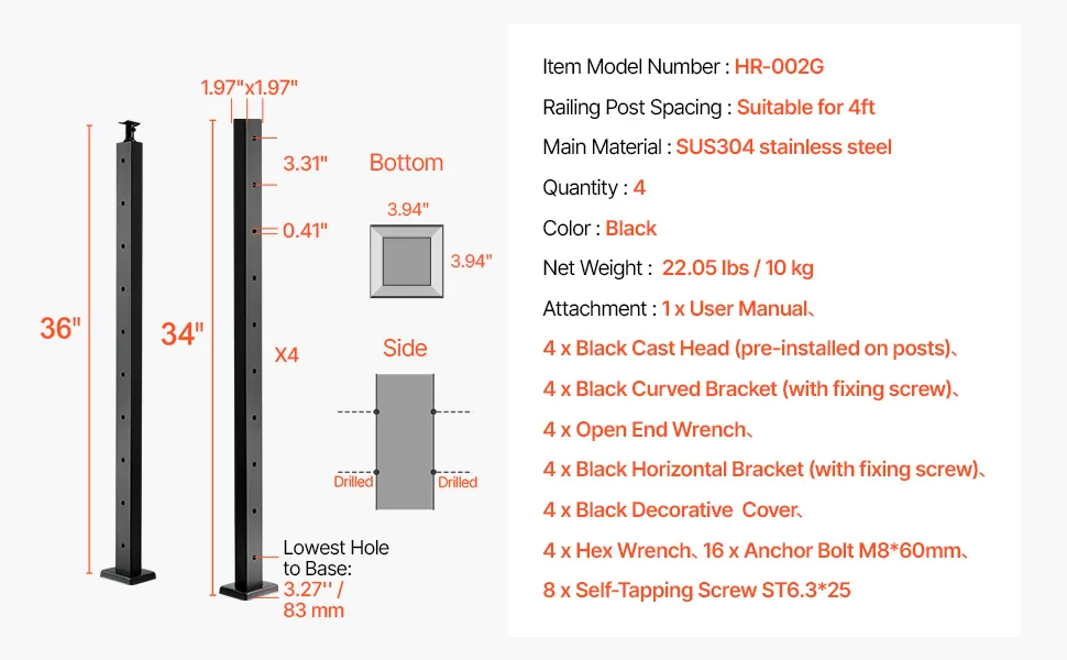 Solidne i trwałe: Nasze słupki do balustrad kablowych wykonane są z wysokiej jakości stali nierdzewnej SUS304, która charakteryzuje się doskonałą odpornością na rdzę i ochroną przed korozją, co przekłada się na długotrwałą trwałość. Nie zaleca się jednak stosowania go w zastosowaniach przybrzeżnych