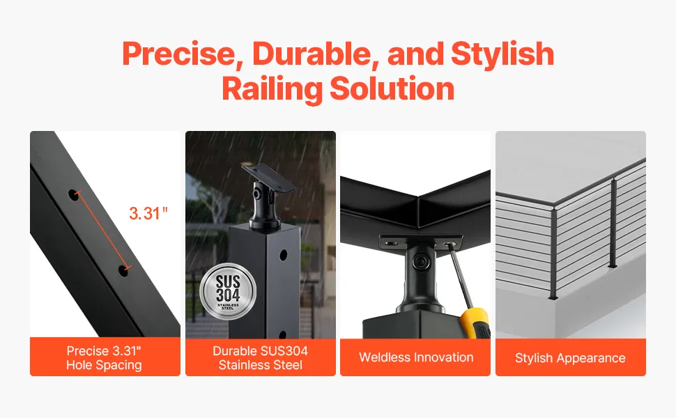 Nasz system balustrad kablowych wykonany jest z wysokiej jakości stali nierdzewnej SUS304 z rozstawem otworów wynoszącym 84 mm, zgodnie z przepisami budowlanymi. Produkt nie jest spawany i ma czarne wykończenie, dzięki czemu jest stylowy i uniwersalny, pasuje do różnych środowisk.
