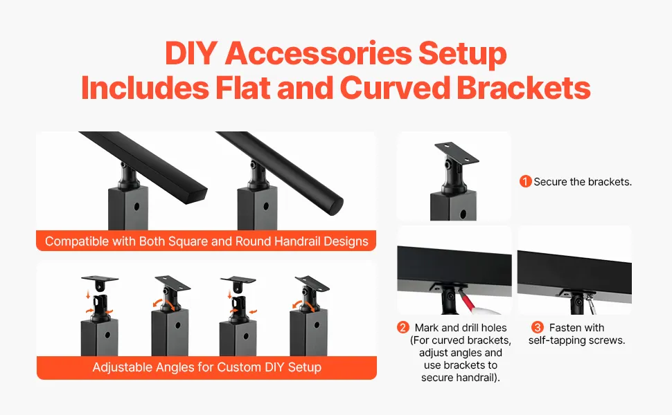 Łatwa instalacja i samodzielny montaż: Ten słupek balustrady tarasowej zawiera poziome i zakrzywione wsporniki, które pasują do różnych typów otworów w słupkach balustrady. Jest kompatybilny zarówno z balustradami o kwadratowych, jak i okrągłych rurach, co pozwala na samodzielną regulację kąta nachylenia balustrady.