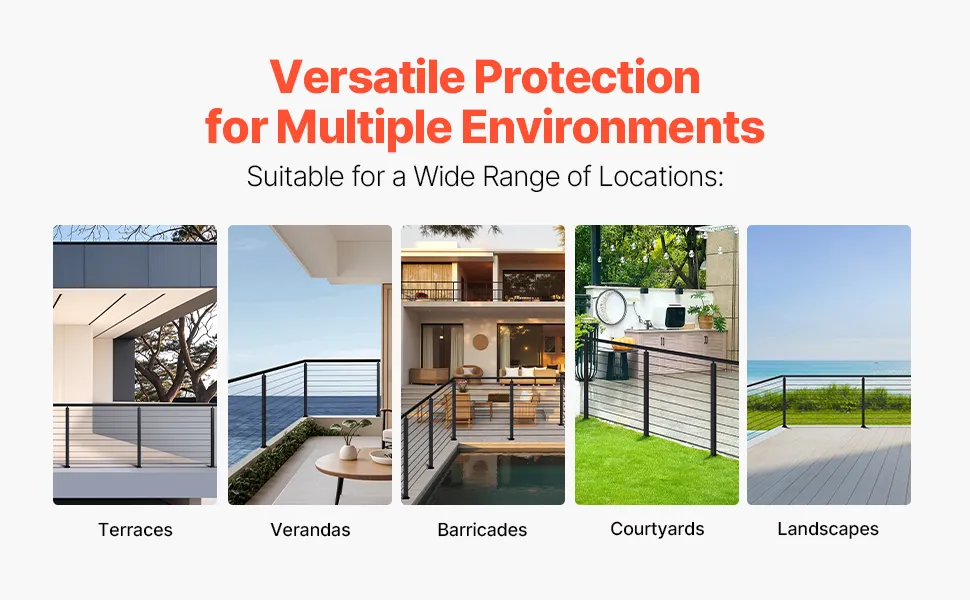 Ochrona w wielu miejscach: Nasze słupki do balustrad kablowych nadają się do ochrony wewnątrz i na zewnątrz, w tym tarasów, schodów, ganków, ogrodzeń, patio, balkonów, ogrodów, budynków mieszkalnych, biur komercyjnych, hoteli, garaży itp.