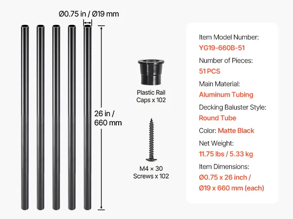 VEVOR Pręt do balustrad schodowych, zestaw 51 elementów, φ19 x 660 mm, aluminiowy pręt dekoracyjny do balustrad schodowych, tralek schodowych, balustrad tarasowych z zaślepkami i śrubami do schodów, ganków, patio, ogrodzeń, czarny