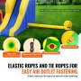 Łatwy w użyciu: Dmuchany zamek jest dostarczany z torbą transportową, co ułatwia transport. Rozkładanie i składanie jest proste, a napompowanie zajmuje mniej niż 3 minuty. Elastyczne linki i pasy mocujące zabezpieczają wylot powietrza, co stanowi wygodniejsze rozwiązanie niż zapięcia na rzepy, które mogą się szybciej zużywać. Przed napompowaniem należy sprawdzić, czy na podłodze nie ma ostrych przedmiotów.