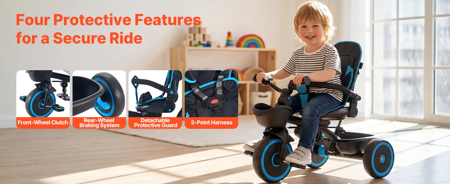 Podwójny system bezpieczeństwa ze sprzęgiem przedniego koła i hamulcem tylnego koła, a także pałąkami zabezpieczającymi i 5-punktowymi pasami bezpieczeństwa zapewniającymi podwójną ochronę – dzięki czemu Twoje dziecko jest bezpieczne podczas każdej jazdy.
