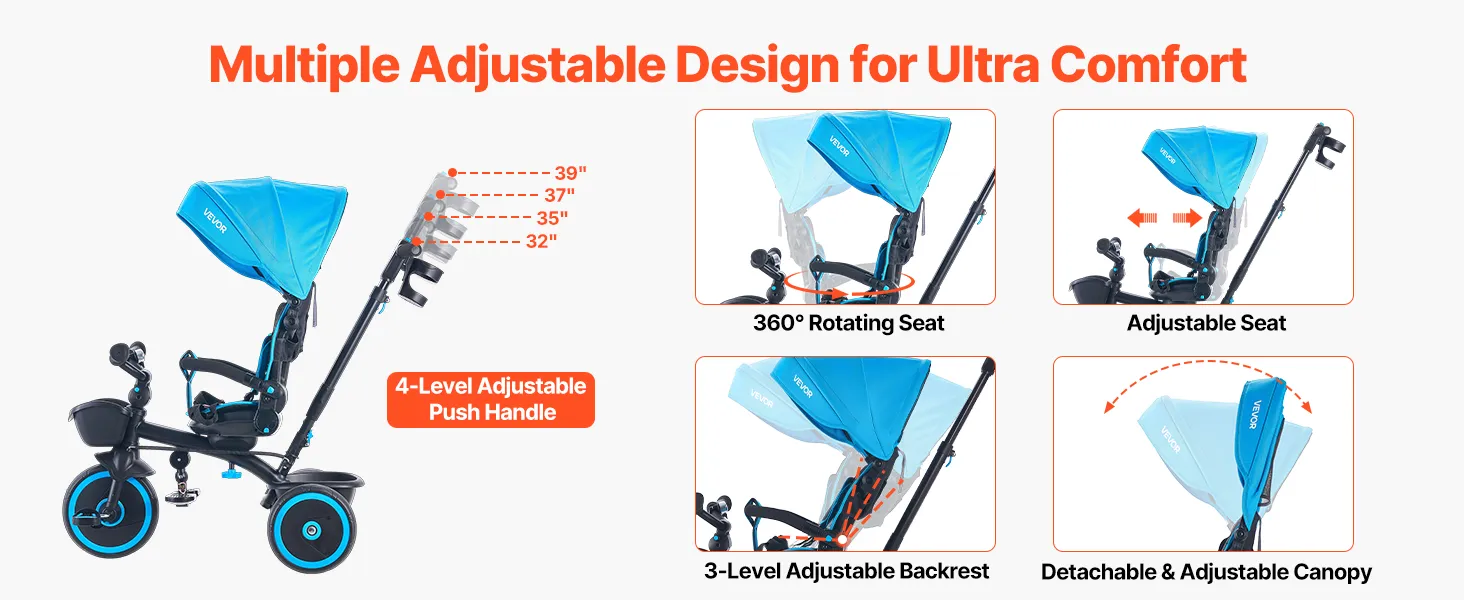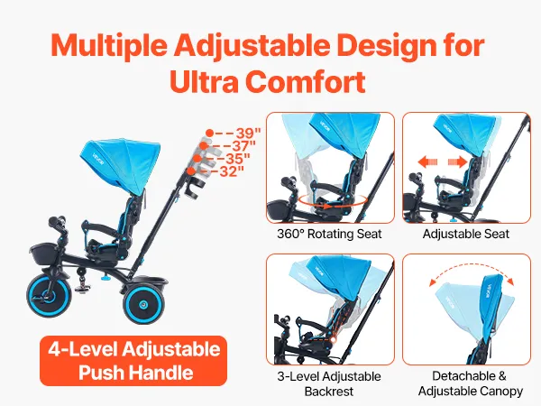 Siedzisko obraca się o 360°, a siedzisko i oparcie są regulowane, co pozwala dzieciom o różnych rozmiarach znaleźć wygodną pozycję siedzącą. Rączka do pchania ma cztery ustawienia wysokości, co ułatwia pchanie.