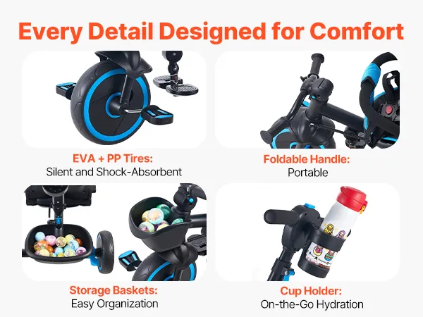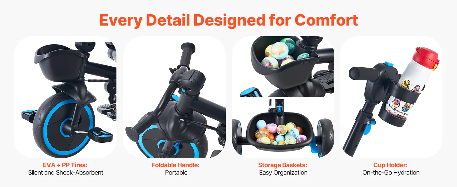 Opony wykonane są z pianki EVA + PP, co zapewnia cichą i amortyzującą jazdę. W zestawie znajduje się również koszyk do przechowywania i uchwyt na kubek, dzięki czemu drobiazgi są zawsze pod ręką.