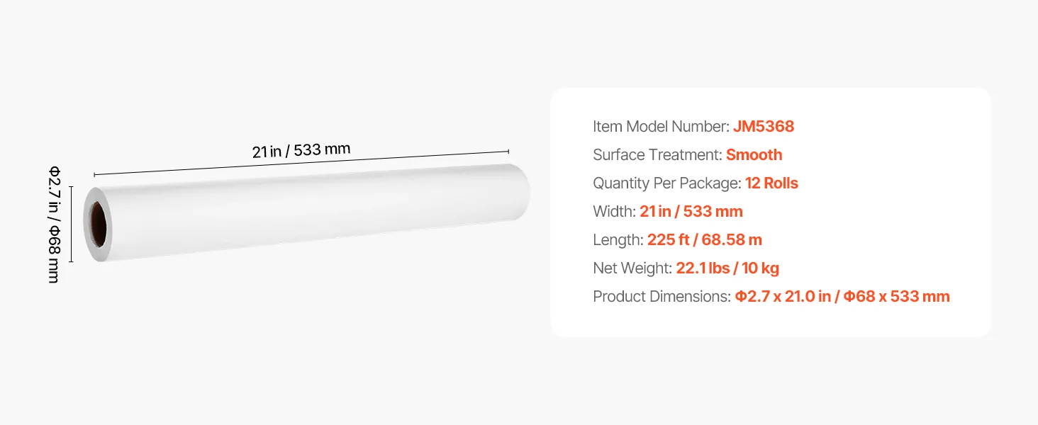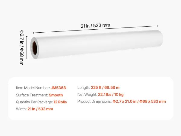 VEVOR Rolka medyczna, 533 mm x 68,58 m, Rolka medyczna (opakowanie 12 sztuk), Jednorazowy pokrowiec na stół, Rolka na stół idealna do spa, żłobków, gabinetów lekarskich, chiropraktyków, stołów do badań i masażu, kolor biały