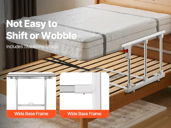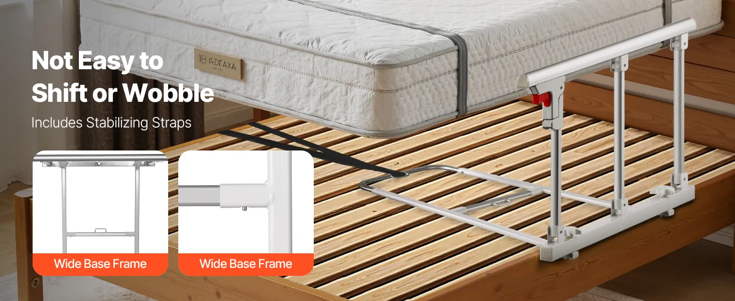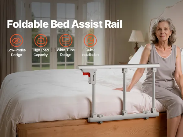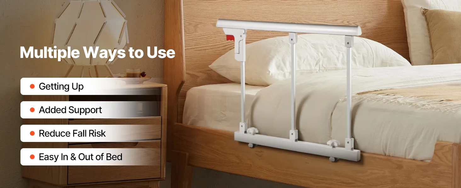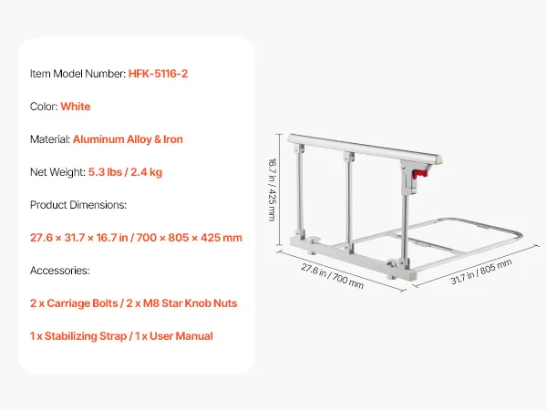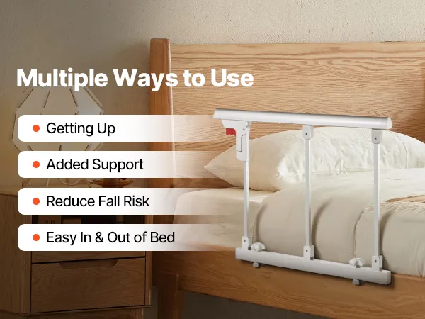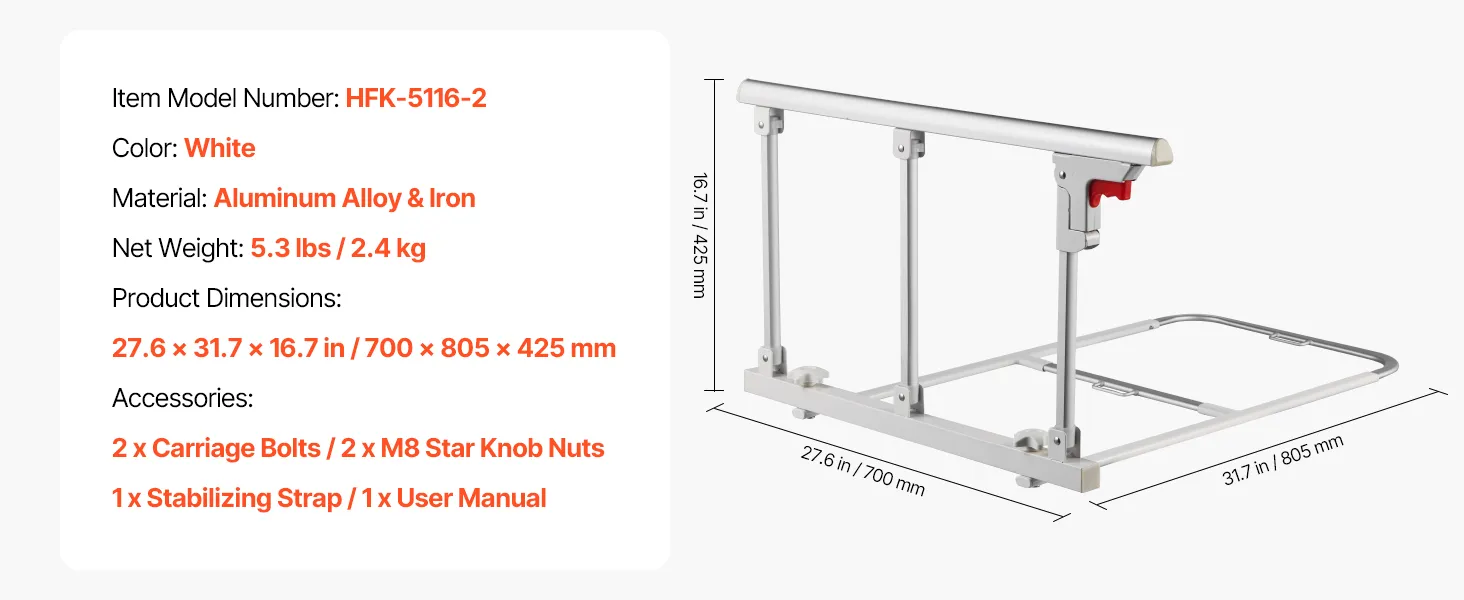 Składana konstrukcja: Gdy poręcz nie jest używana, wystarczy nacisnąć czerwony przycisk, aby ją złożyć. Taka konstrukcja nie utrudnia wsiadania i wysiadania, a także zmniejsza ryzyko uderzeń i potknięcia. Pasuje do łóżek podwójnych, queen-size i king-size z materacami o grubości 178–330 mm. Nie nadaje się do łóżek elektrycznych.