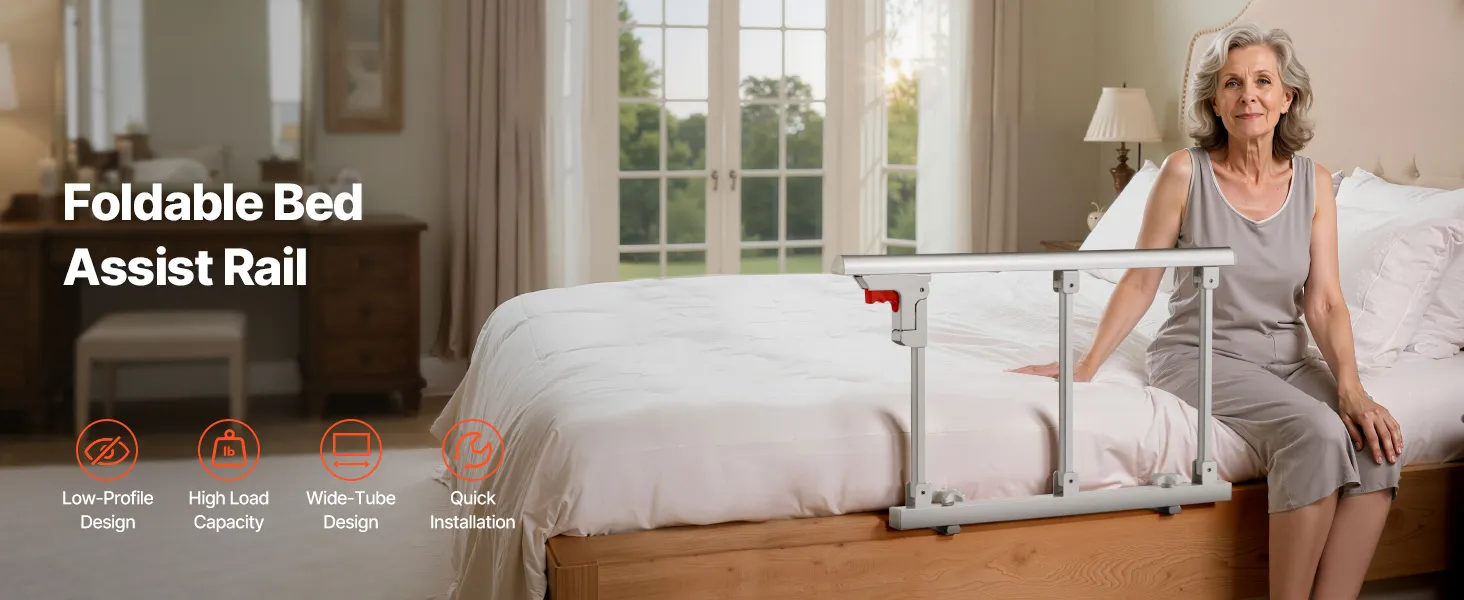 Łatwo składa się i chowa na krawędzi łóżka, co ułatwia wchodzenie i wychodzenie, optymalizuje wykorzystanie przestrzeni i minimalizuje ryzyko uderzeń lub potknięć, a tym samym zapewnia bezpieczeństwo użytkownika.
