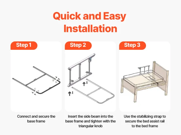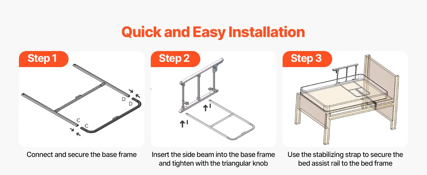 Szybki i łatwy montaż: Barierkę łóżkową dla seniorów można łatwo zamontować bez użycia narzędzi i pomocy fachowca. Wystarczy postępować zgodnie z instrukcją, a montaż zajmie kilka minut.